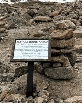 I remember several parts of the climb – and each presents a different kinds of challenge: there are enormous vertical rock faces exposed to falling rock, which requires scrambling on all fours; there are narrow ledges, which require you just not look down; and, even in the summer, depending upon conditions, you can expect to encounter snow and ice. The part I remember as most daunting, though, was that Boulder Field, which was what you encountered first when you emerged from the forest and left the protection of the trees. From there you scrambled over boulders toward an opening in the rock face called the Keyhole. The actual Keyhole Route begins after the Boulder Field. The last 1.5 miles after the Keyhole is by far the most difficult, exposed and hazardous portion of the route.