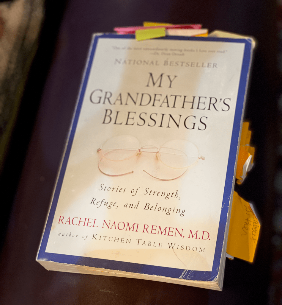 My Grandfather’s Blessings: Stories of Strength, Refuge, and Belonging, by Rachel Naomi Remen, M.D., (Riverhead Books, New York, 2000) has long been a favorite, in part because she not only tells wonderful stories, but she also encourages and celebrates us all recognizing our blessings in hearing one another’s stories and in telling our own. As you can see, this copy has been well-used.
